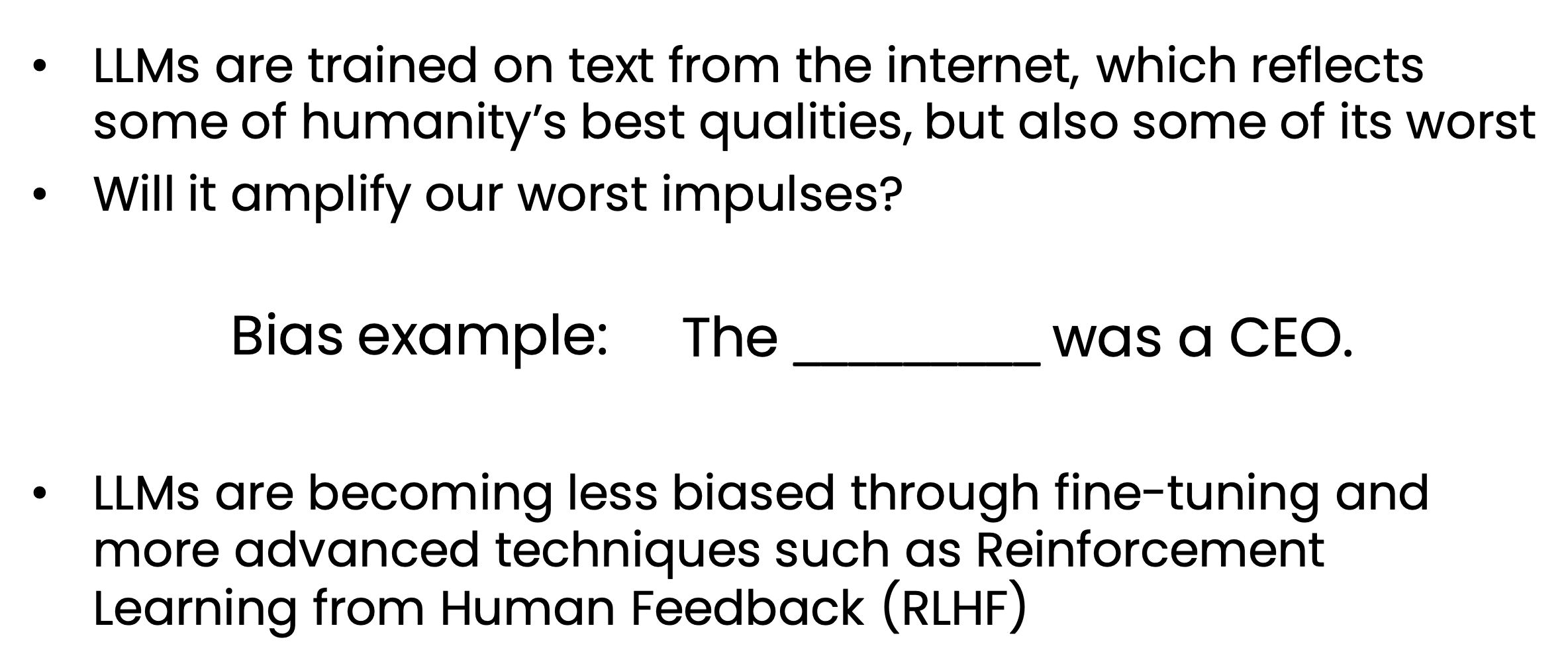 - Bias and toxicity (e.g., just assumes that doctors are men and nurses are women)
